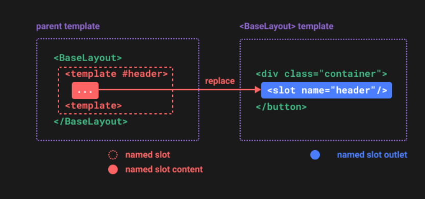 부모 컴포넌트에서 <BaseLayout>을 사용할 때, multiple slot content 조각을 넘기는 방법이 필요한데, 다른 slot outlet을 각각 타겟으로 해야 한다. named slots이 필요한 때 이다.