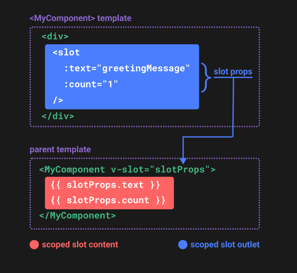 하지만, 슬롯의 컨텐츠가 부모 스코프와 자식 스코프 둘 다의 데이터를 사용하도록 만드는 것이 유용한 경우가 있다. 이를위해, 렌더링 될 때, 자식이 슬롯에게 데이터를 넘기기위한 방법이 필요하다.