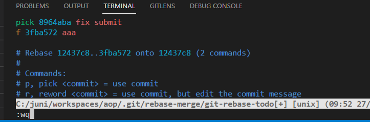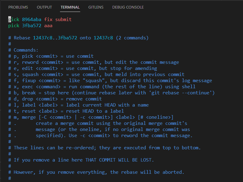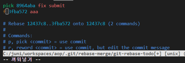 aaa커밋을 fix submit 커밋에 합치고 싶으면, 아래 Commands중에 적당한 것을 골라서 수정한다.