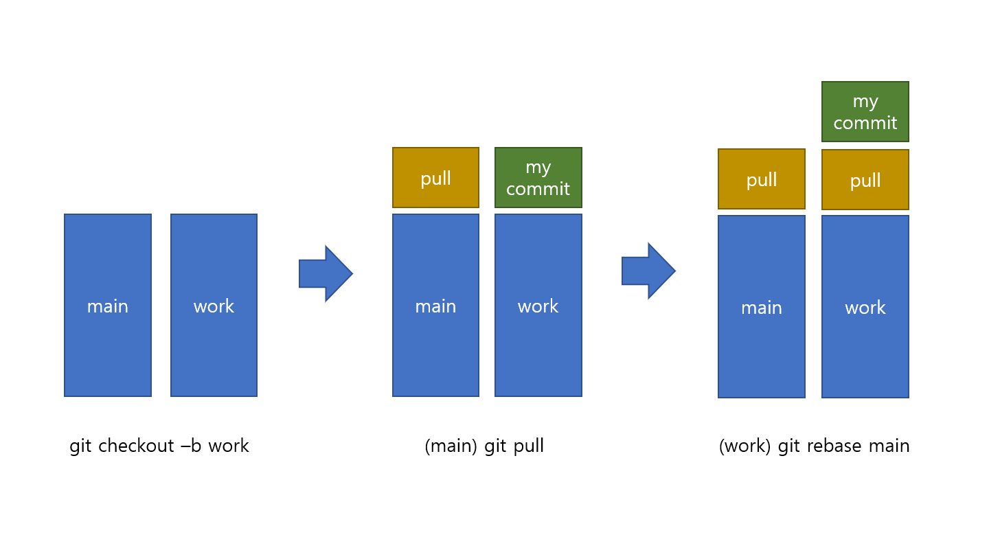 | (작업 브랜치에서) git rebase main | 메인 브랜치 내용을 작업브랜치에 동기화 시킨다. |